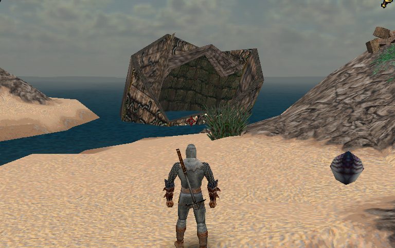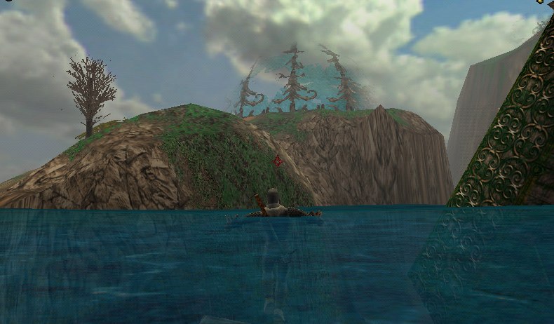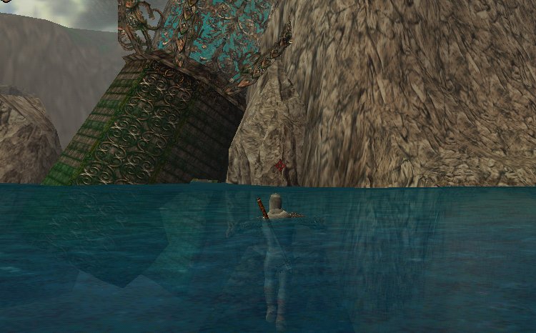 - Between the wolf island and the main island is a very large tower that's partially submerged underwater. If you swim up to the East side of this tower and dive underwater, you'll find you can swim up inside of it. There's a chest floating inside here. It contains some gold, 2 yellow potions, and some Chain Gauntlets.